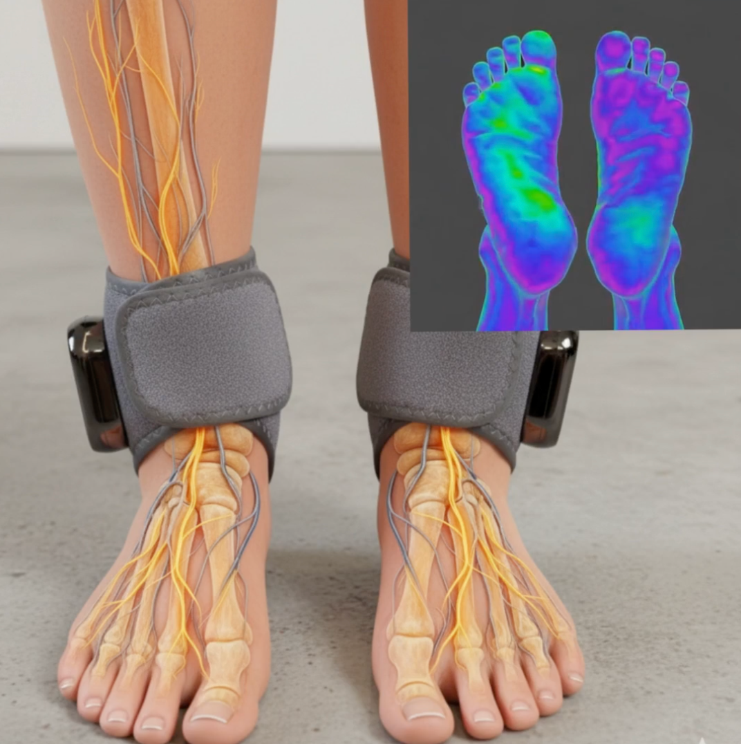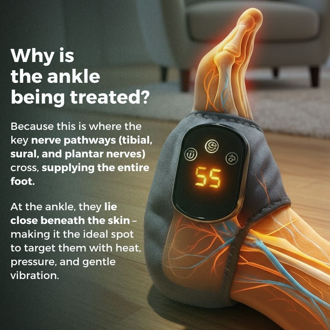 The device applies directly to the ankle, where major nerves and blood vessels run that supply the entire foot and lower leg. This allows the effects to penetrate more deeply than conventional foot massages or topical creams that only work on the surface.